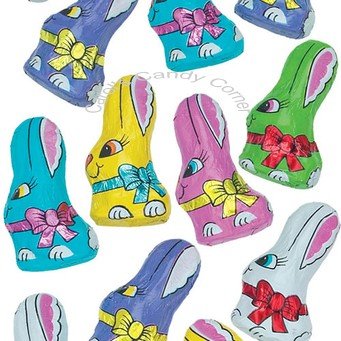 - Long eared rabbits foil wrapped six different colored bunny foils, decorated for Easter with ribbon around their neck